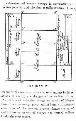 Liberation of neuron energy is correlative with active psychic and physical manifestations. Hence states of the nervous system corresponding to liberations of energy are designated as waking states. Restitution of expended energy or arrest of liberation of neuron energy goes hand in hand with passive conditions of the nervous system; hence states of restitution or arrest of energy are termed collectively sleeping states.