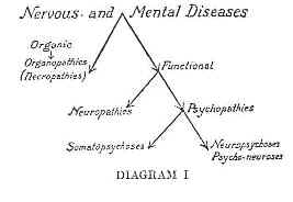 CHAPTER VII FORMS OF NEUROSIS A brief outline of a classification of nervous and mental diseases, made by me in my various works, may be of help towards a clear understanding of neurotic disturbances. The different forms of nervous and mental diseases may be classified into Organic and Functional. By organic affections I mean to indicate pathological modifications of the neuron and its processes taking place in the very structure (probably the cytoreticulum) of the nerve cell. Under this category come such maladies as general paresis, dementia praecox, all mental and nervous affections of a degenerative and involutionary character. Such diseases are termed by me Organopathies, or Necropathies. By functional affections I mean to indicate all neuron changes in which the functions of the neuron and its reactions to external and internal stimulations are involved in the pathological process without, however, affecting the anatomical structure of the nerve cell. The pathological changes are not permanent,―recovery of normal function is possible with the restitution of favorable conditions of nutrition and elimination. Functional nervous and mental diseases are in turn subdivided into Neuropathies and Psychopathies. Neuropathic diseases are disturbances of functioning activity, due to defective neuron matabolism, brought about by external stimuli, and more specially by harmful internal stimuli―glandular secretions, hormones, toxic and autotoxic agencies. The pathological, neuropathic process produces few, if any anatomical, changes in the structure of the neuron. The pathology of neuropathic diseases, probably of the cytoplasm) is essentially chemico-physiological in nature. Neuropathic diseases include maladies in which the neuron undergoes degenerative changes. At first there is an apparent increase, then an inhibition, and finally a complete suspension of neuron function, not terminating in the destruction of the neuron. Neuron restitution is possible. Such affections are produced by mild poisons, organic, or inorganic, by autotoxic products, by hyposecretion or hypersecretion, or by absence of hormones in the economy of the organism. Here belong all the temporary, or recurrent maniacal, melancholic, delusional states, puerperal mania, epileptic insanity, the mental aberrations of adolescent and climacteric periods, periodic insanity, alternating insanities, and in general all the mental affections known under the description of manic-depressive insanity. Where the disease depends on the interrelation of neurons in a complex group, on association of systems of neurons, the condition is psychopathic in nature. In psychopathic troubles the neuron itself may remain unaffected, may be perfectly normal and healthy. The disorder is due to association with systems of neurons which are usually not called into action by the function of that particular neuron system. By Organopathies or Necropathies I indicate a group of psychophysiological symptoms, accompanied by structural, necrotic changes of the neuron, terminating in the ultimate death of the neuron systems, involved in the pathological process. By Neuropathies I indicate a group of psycho-physiological manifestations due to pathological functional neuron modifications, capable of restitution through normal metabolism. By Psychopathies I designate pathological phenomena of psychophysiological dissociation and disaggregation of neuron systems and their functions in clusters, the neuron itself and its special function remaining undamaged. The psychopathies are further subdivided into Somatopsychoses and Psychoneuroses or Neuropsychoses. The somatopsychoses are characterized by somatic symptoms, by disturbances of bodily functions, such as paralysis, contractures, convulsions, anesthesia, analgesia, hyperalgesia, and other sensory disturbances, as well as by intestinal, cardiac, respiratory, and genito-urinary troubles. The psychoneuroses or Neuropsychoses are characterized by mental symptoms. The patient's whole mind is occupied with mental troubles. Such conditions are found in obsessions, fixed ideas, imperative impulses, emotional compulsions, and other allied mental and nervous maladies. Somatopsychoses simulate physical and organic nervous troubles. Thus, many "hysterical" forms simulate tabes, or paralysis agitans, hemiplegia, paraplegia, or epilepsy, while many of the neurasthenic, hypochondriacal, and their allied states may simulate tumor, cancer, intestinal and glandular derangements, cardiac, laryngeal, pneumonic, hepatic, splanchnic ovarian, tubal, uterine, renal, and other bodily afflictions. The neuropsychoses or psychoneuroses simulate all forms of mental disease, beginning with melancholia and mania, and ending with general paresis and dementia. Psychoneurosis and somatopsychosis are diseases of the subconscious; in the former mental, in the latter physical symptoms predominate. Psychopathic states should be rigidly differentiated from other disturbances, such as neuropathies organopathies, or necropathies. The following diagram may be of help: