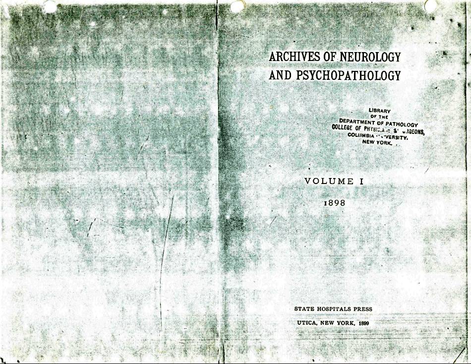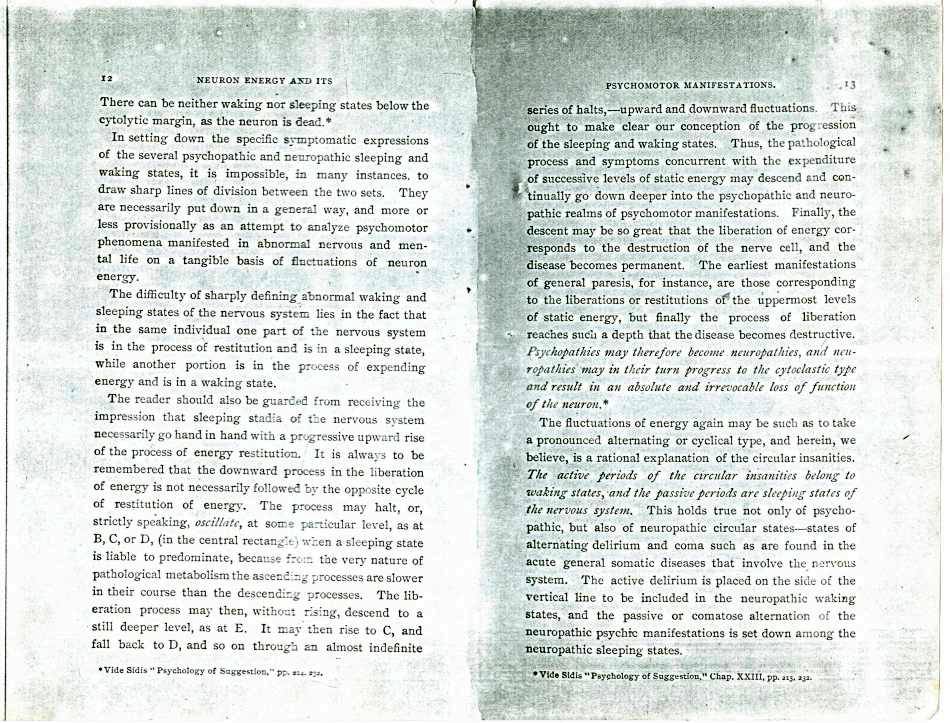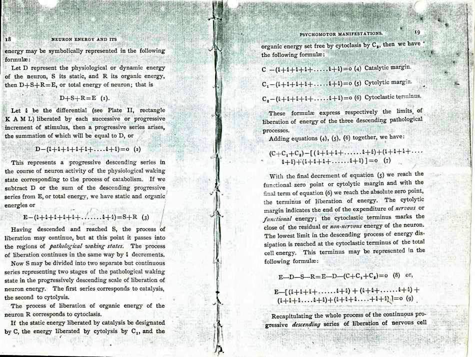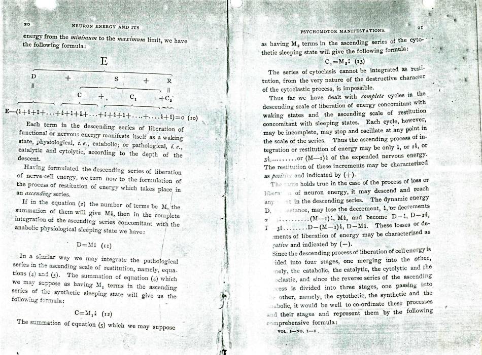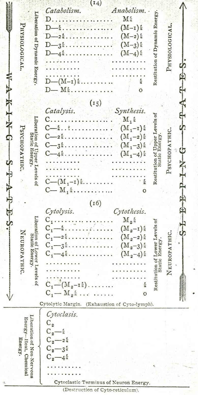 Formulæ (14), (15) and (16) illustrate the phases of seeming arrests, but really of oscillations in the progression of the processes of liberation or restitution of energy. In catalysis, for instance, liberation of energy may oscillate at the level, C – 1, when a sleeping state may predominate. The catalytic process may then descend to a lower stage of the series, C – 4e/n, and during the descent there is a waking state. If an oscillation occurs at the level, C – 4e/n, a sleeping state again preponderates. Certain cases of cyclical insanity manifesting alternations of waking and sleeping states with slight or no restitution of energy may serve as a case in point. The process of liberation of energy has, slipped from one level to a deeper one, thence to a still deeper level, oscillating for a period at each of these levels. In the same way, in formula (15), in the right hand column of series, corresponding to the synthetic process, we may have a similar symbolical illustration of oscillatory periods in the restitution of energy. The upper levels of static energy in any particular individual may be reduced to the catalytic margin, the process of disintegration may become arrested at this point and the reverse process of synthesis may begin; the process of restitution of energy may rise by e/nths. The recuperation of the energy corresponding to synthesis may rise say to (M1 – 4)e/n (formula 15, right hand column); after oscillating there a while it may rise to a higher level of the series such as (M1 – 1)e/n, and so on until all the upper levels of static energy expressed by the final member of the ascending series, M1e/n, are recovered. The individual has recovered all the upper levels of his static energy and is on the way to become normal; he is about to step across the, border line into the realm of the normal, physiological sleeping state. We may conclude this brief preliminary communication with a few laws relating to the metabolic processes of neuron activity: (I)—Catalysis stands in direct and synthesis in inverse ratio to the number of disaggregated neuron associations. (II)—All other conditions remaining the same, the instability of a cell aggregate is proportionate to the number and complexity of its associative functioning groups.11 (III)—The stability of a neuron aggregate is proportionate to the frequency and duration of its associative activity.12 (IV)—The instability of a neuron aggregate its proportionate to the frequency and duration of the interruptions in its functioning activity.13 (V)—The mass of formed metaplasm granules14 stands in direct ratio to the intensity of cytolysis and in inverse ratio to the progress of cytothesis.