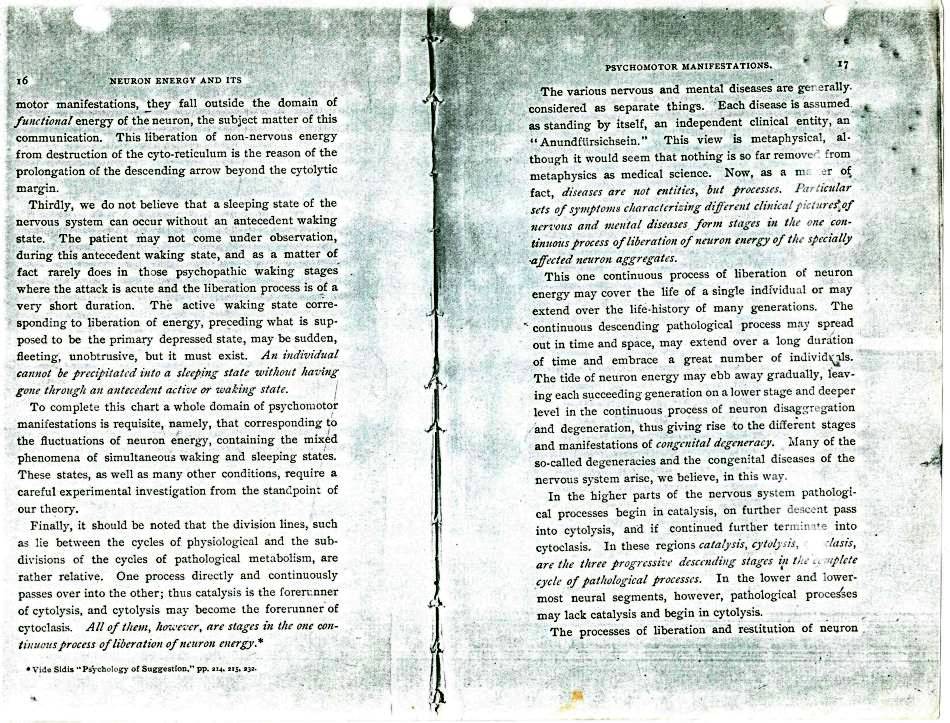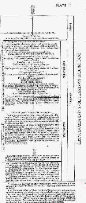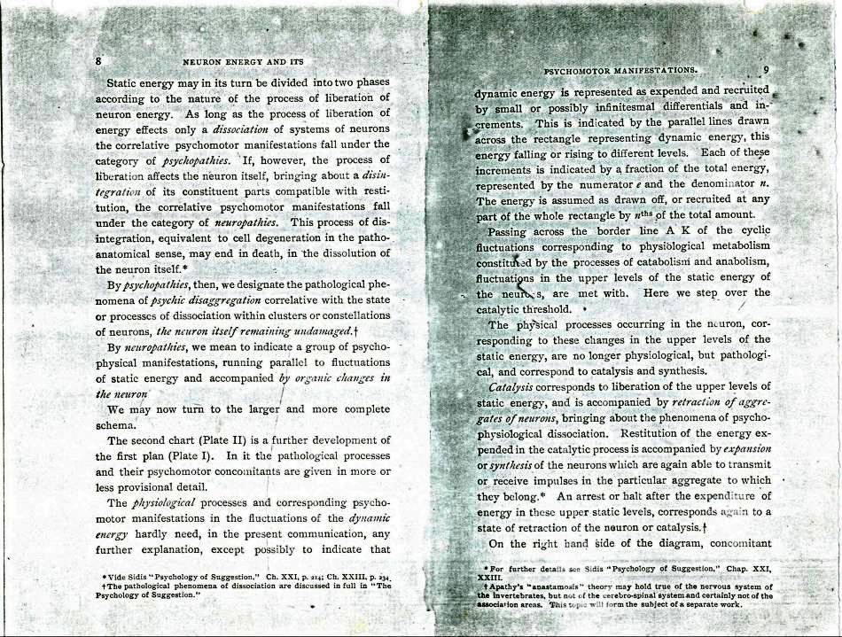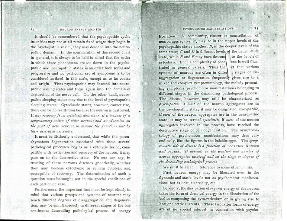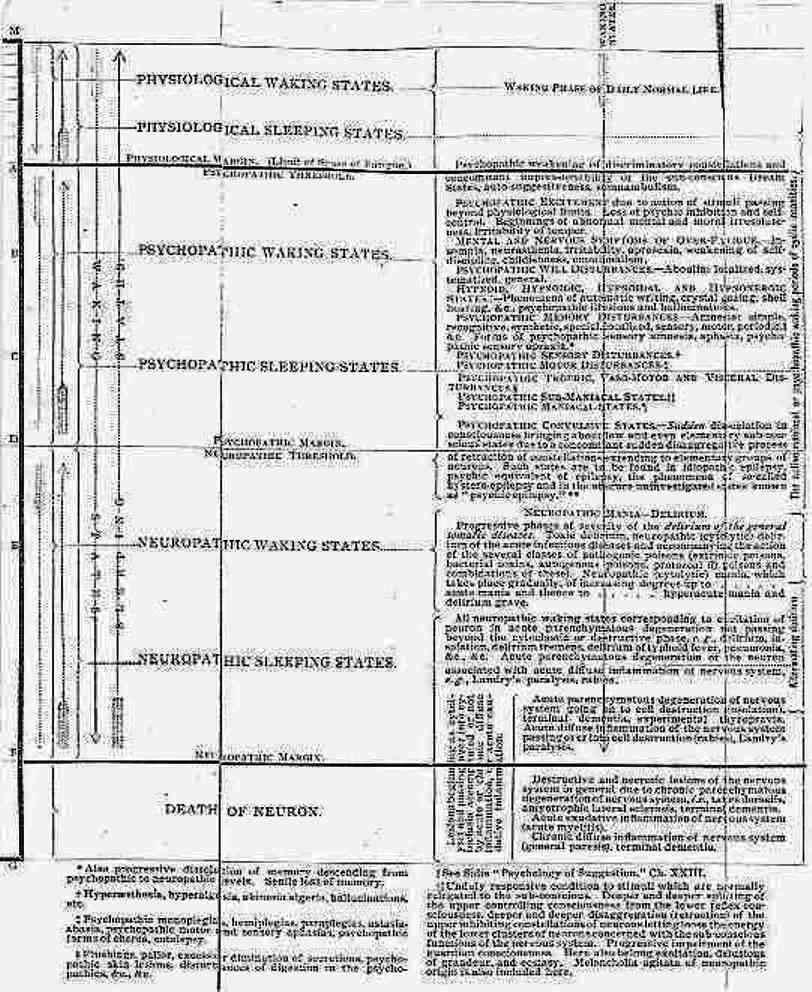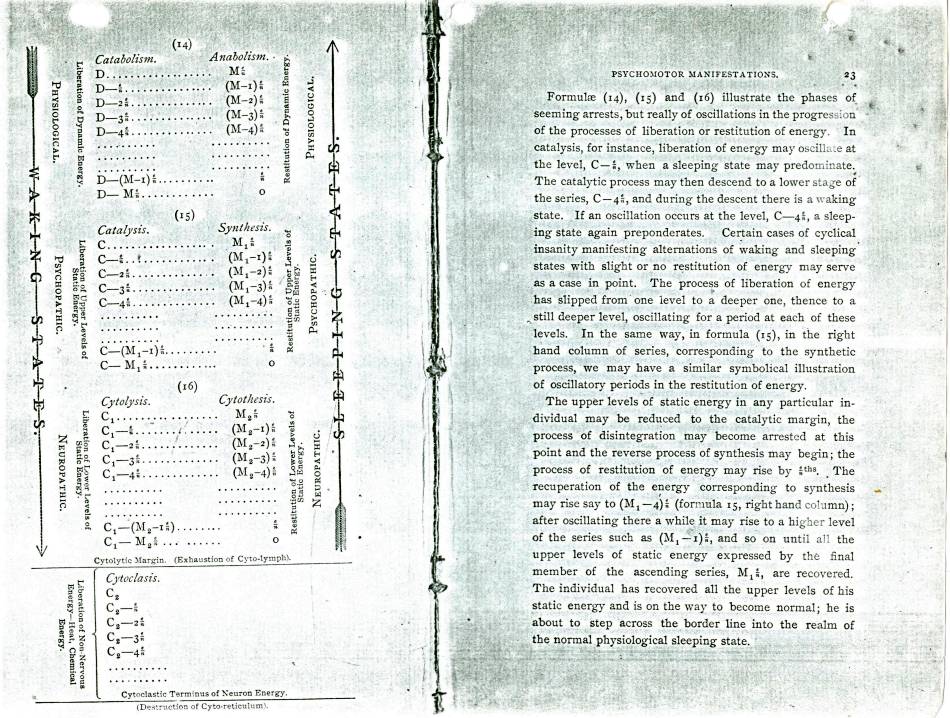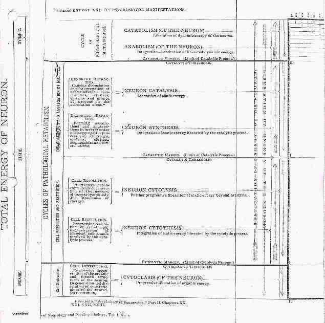 (Click / Tap images to enlarge.) PLATE II The physiological processes and corresponding psychomotor manifestations in the fluctuations of the dynamic energy hardly need, in the present communication, any further explanation, except possibly to indicate that dynamic energy is represented as expended and recruited by small or possibly infinitesimal differentials and increments. This is indicated by the parallel lines drawn across the rectangle representing dynamic energy, this energy falling or rising to different levels. Each of these increments is indicated by a fraction of the total energy, represented by the numerator e and the denominator n. The energy is assumed as drawn off, or recruited at any part of the whole rectangle by nths of the total amount. Passing across the border line A K of the cyclic fluctuations corresponding to physiological metabolism constituted by the process of catabolism and anabolism, fluctuations in the upper levels of the static energy of the neurons, are met with. Here we step over the catalytic threshold. The physical process occurring in the neuron, corresponding to these changes in the upper levels of the static energy, are no longer physiological but pathological, and corresponds to catalysis and synthesis. Catalysis corresponds to liberation of the upper levels of static energy, and is accompanied by retraction of aggregates of neurons, bringing about the phenomena of psychophysiological dissociation. Restitution of the energy expended in the catalytic process is accompanied by expansion or synthesis of the neurons which are again able to transmit or receive impulses in the particular aggregate to which they belong.3 An arrest or halt after the expenditure of energy in these upper static levels, corresponds again to a state of retraction of the neuron or catalysis.4 On the right-hand side of the diagram, concomitant with the processes of catalysis or synthesis of the neuron, we find corresponding states of psychic disaggregation and aggregation: psychopathic waking states or states of mental dissociation going hand in hand with catalysis, and psychopathic sleeping states with the process of synthesis. In the second column, on the right-hand side of the diagram, a general outline is given of the detailed manifestations of the psychopathic waking states. These are given in the sequence in which they occur, as far as we can determine in the present writing, according to the progression of catalytic processes passing from the very highest constellations of neurons which the nervous system possesses, down through lower and lower associations and finally into groups of neurons.5 In the third column to the right of the central rectangle in the diagram are given some of the specific manifestations of the neuron associations during the psychopathic sleeping state, in the upper levels of static energy have reached the maximum of their expenditure, and ascend toward the normal physiological level by the process of restitution of energy. These cycles in the rise or fall of energy are always indicated by the direction of the smaller arrows on either side of the central rectangle, representing the total energy of the neuron. Psychopathic manifestations correspond to the processes of catalysis and synthesis of the neurons, or to an arrest in the liberation of energy after catalysis has progressed to a certain degree. Passing now beyond the catalytic margin in the expenditure of static energy of the neuron, we may consider the further expenditure of static energy. Here we step over the catalytic threshold. The pathological process corresponding to expenditure of the levels of static energy beneath the cytolytic threshold is termed cytolysis of the neuron, which means cell resolution. At this point organic and structural changes are found in the neuron, more particularly in the character of the cytolymph.6 We have here the initial stages of the process of neuron degeneration, and the term cytolysis indicates such phases of parenchymatous degeneration of the neurons which may lead either to restitution or destruction. Cytolysis, therefore, embraces the phases of organic degeneration of the neurons up to, but not beyond the borderline of destruction in the process of this degeneration. The regeneration of theses degenerative changes in the call, not overstepping the limits of destructive alterations in the neuron, is termed cytothesis. It is the reverse of cytolysis. Corresponding again to the pathological processes of cytolysis and cytothesis, going hand in hand with fluctuations in the lower levels of static energy, are the concomitant neuropathic waking and sleeping states with their psychomotor manifestations. Broadly speaking, psychopathies run parallel to the phenomena of retraction and expansion of aggregates of neurons, while neuropathies are concomitant with actual degeneration of the neuron, especially of its cytolymph. The expenditure of organic energy is accompanied with cell-destruction or cytoclasis.7 Cytoclasis is the destructive outcome of degeneration of the neurons―parenchymatous degeneration of the nervous system, acute or chronic. This can be neither sleeping nor waking states below the cytolytic margin, as the neuron is dead.8 In setting down the specific symptomatic expressions of the several psychopathic and neuropathic sleeping and waking states, it is impossible, in many instances, to draw sharp lines of division between the two sets. They are necessarily put down in a general way, and more or less provisionally as an attempt to analyze psychomotor phenomena manifested in abnormal nervous and mental life on a tangible basis of fluctuations of neuron energy. The difficulty of sharply defining abnormal waking and sleeping states lies in the fact that in the same individual one part of the nervous system is in the process of restitution and is in a sleeping state, while another portion is in the process of expending energy and is in a waking state