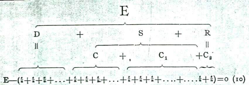 Each term in the descending series of liberation of functional or nervous energy manifests itself as a waking state, physiological, i.e., catabolic; or pathological, i.e., catalytic and cytolytic, according to the depth of the descent. Having formulated the descending series of liberation of nerve-cell energy, we turn now to the formulation of the process of restitution of energy which takes place, in an ascending series. If in the equation (2) the number of terms be M, the summation of them will give Me/n, then in the complete integration of the ascending series concomitant with the anabolic physiological sleeping state we have: D = Me/n (11) In a similar way we may integrate the pathological series in the ascending scale of restitution, namely, equations (4) and (5). The summation of equation (4) which we may suppose as having M1 terms in the ascending series of the synthetic sleeping state will give us the following formula: C = M1e/n (12) The summation of equation (5) which we may suppose as having M1 terms in the ascending series of the synthetic sleeping state will give us the following formula: C = M1e/n (12) The summation of equation (5) which we may suppose as having M2 terms in the ascending series of the cytothetic sleeping state will give the following formula: C1 =M2e/n (13) The series of cytoclasis cannot be integrated as restitution, from the very nature of the destructive character of the cytoclastic process, is impossible. Thus far we have dealt with complete cycles in the descending scale of liberation of energy concomitant with waking states and the ascending scale of restitution concomitant with sleeping states. Each cycle, however, may be incomplete, may stop and oscillate at any moment in the scale of the series. Thus the ascending process of integration or restitution of energy may be only e/n, or 2e/n, or 3e/n…..or (M – 1)e/n of the expended nervous energy. The restitution of these increments may be characterized as positive and indicated by (+). The same holds true in the case of the process of loss or liberation of neuron energy, it may descend and reach any point in the descending series. The dynamic energy D, for instance, may lose the decrement, e/n, or decrements 2e/n, 3e/n…….. (M – 1)e/n, Me/n, and become D – e/n, D – 2e/n, D – 3e/n……..D - (M – 1)e/n, D – Me/n. These losses or decrements of liberation of energy may be characterized as negative and indicated by (–). Since the descending process of liberation of cell energy is divided into four stages, one merging into the other, namely, the catabolic, the catalytic, the cytolytic and cytoclastic, and since the reverse series of the ascending process is divided into three stages, one passing into the other, namely, the cytothetic, the synthetic and the anabolic, it would be well to co-ordinate these processes and their stages and represent them by the following comprehensive formula: