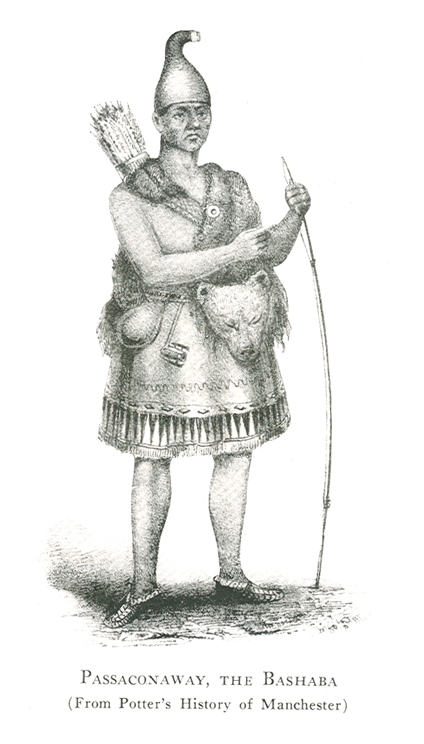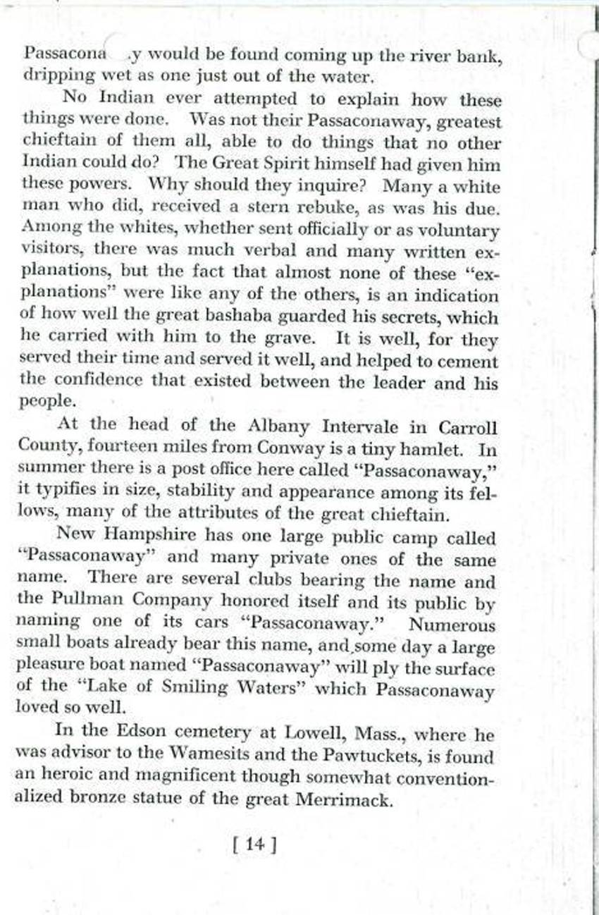 "We first hear of Passaconaway in history in 1627. Thomas Morton, being in this country at this time, thus writes of him in his "New English Canaan": "'Papasiquineo the Sachem or Sagamore of the territories near Merrimack River, a man of the best note in all those parts (and as my countryman, Mr. Wood, declares in his prospect) a great nigromancer. That Sachem or Sagamore is a Powah of greate estimation amongst all kinde of Salvages then hee at their Revels (which is the time when a greate company of Salvages meete from severall partes of the Countre in amity with the neighbors) hath advanced his honor in his feats or jugling tricks to the admiration of the spectators whom hee endeavored to persuade that hee would go under the water to the further side of the river to broade for any man to undertake with a breath which thing he performed by swimming over and deluding the company with casting a mist before their eyes that see him enter in and come out; but no part of the way hee has bin seene; likewise by our English in the heat of all summer to make Ice in a bowl of faire water first having the water set before him hath begun his incantation according to their Usual accustom and before the same has been ended a thick cloude has darkened the aire and on a sudane a thunder clap hath bin heard that has amazed the natives; in an instant hee hath showed a firme peace of Ice to floate in the midste of the bowle in the presence of the vulgar people which was doubtless done by the agility of Satan his consort." Coburn, Silas R., HISTORY OF DRACUT MASS. Lowell: Press of the Courier-Citizen Co., 1922. Pp. 30-31. |