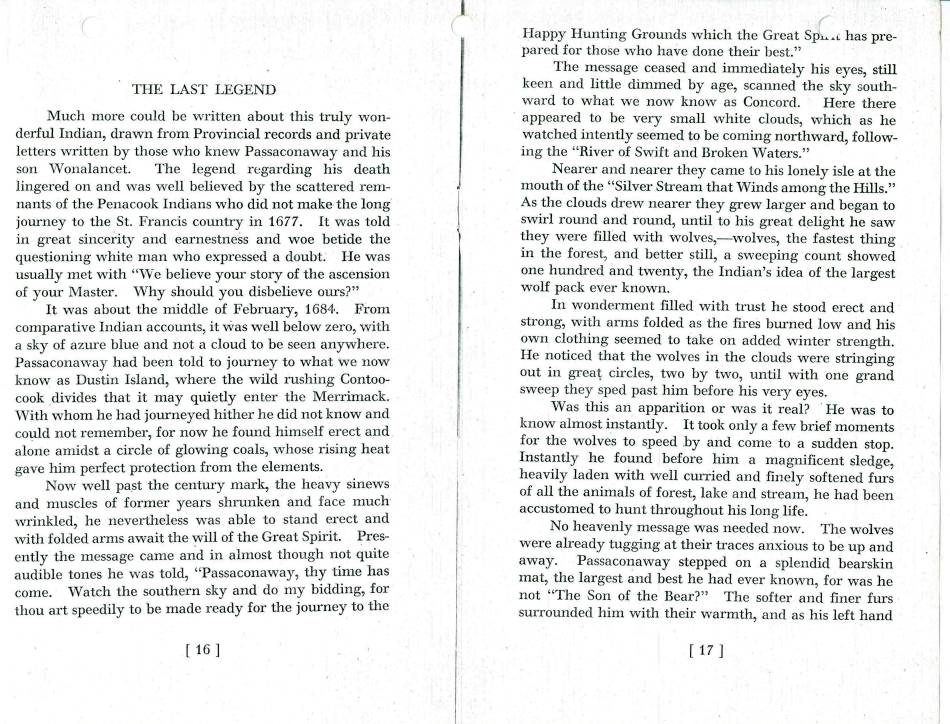 Passaconaway was famous for his almost superhuman feats of strength and magic. While he performed some of these elsewhere as he went among the tribes from Winnepesaukees and Ossipees on the north, to the Narragansetts on the south, his best work in this line was done at Amoskeag, where was to be found the perfect setting for all that he desired to accomplish in maintaining his position with the tribes. Many of the things that he did seem difficult to explain, but that he did them, in full view of both Indians and whites, there is no doubt. Both official and unofficial groups came from afar on divers occasion, ample testimony to the authenticity of these events was given both verbally and in writing, to the authorities at Massachusetts. One member of an investigating committee reported that he no doubt did the tricks, if such they were, but that he did so with the aid of his "Consort the Devil." After he accepted Christianity he sought the advice of the Apostle Eliot who advised wisely, in view of his intimate knowledge of the Indian mind, that they might continue so long as he did not ascribe what he did as due to the favor of deity. What did the Amoskeags and their visitors witness at Amoskeag Falls in what is now Manchester? They saw "rocks move, trees dance, green leaves in winter, blocks of ice in summer, squirming, harmless adders in winter, frozen fish and frosted branches in summer, and at any season dry leaves curling up and burning in a bowl, without apparent cause." He could seemingly call mists to envelope himself together with all those immediately near him, and to disperse the same mist at will. He would stand erect upon a pile of small dry sticks, have them ignited until he seemed to be a veritable flaming man. The mist would come and when presently it had gone, he would be found calm and unharmed. Reversing the process, the mists would come while there was no fire. Instantly flames would appear, only to have entirely vanished when the fleecy clouds passed on. Perhaps his most spectacular feat was accomplished while there were numbers of his own and of white visitors grouped on the river bank. The mist would come and when it had gone he would be found on the other shore with arms upraised. The watchers would soon be again, enveiled in mist, which soon passed on, when Passaconaway would be found coming up the river bank, dripping wet as one just out of the water. No Indian ever attempted to explain how these things were done. Was not their Passaconaway, greatest chieftain of them all, able to do things that no other Indian could do? The Great Spirit himself had given him these powers. Why should they inquire? Many a white man who did, received a stern rebuke, as was his due. Among the whites, whether sent officially or as voluntary visitors, there was much verbal and many written explanations, but the fact that almost none of these "explanations" were like any of the others, is an indication of how well the great bashaba guarded his secrets, which he carried with him to the grave. It is well, for they served their time and served it well, and helped to cement the confidence that, existed between the leader and his people. ---------- THE LAST LEGEND Much more could be written about this truly wonderful Indian, drawn from Provincial records and private letters written by those who knew Passaconaway and his son Wonalancet. The legend regarding his death lingered on and was well believed by the scattered remnants of the Penacook Indians who did not make the long journey to the St. Francis country in 1677. It was told in great sincerity and earnestness and woe betide the questioning white man who expressed a doubt. He was usually met with "We believe your story of the ascension of your Master. Why should you disbelieve ours?" It was about the middle of February, 1684. From comparative Indian accounts, it was well below zero, with a sky of azure blue and not a cloud to be seen anywhere. Passaconaway had been told to journey to what we now know as Dustin Island, where the wild rushing Contoocook divides that it may quietly enter the Merrimack. With whom he had journeyed hither he did not know and could not remember, for now he found himself erect and alone amidst a circle of glowing coals, whose rising heat gave him perfect protection from the elements. Now well past the century mark, the heavy sinews and muscles of former years shrunken and face much wrinkled, he nevertheless was able to stand erect and with folded arms await the will of the Great Spirit. Presently the message came and in almost though not quite audible tones he was told, "Passaconaway, thy time has come. Watch the southern sky and do my bidding, for thou art speedily to be made ready for the journey to the Happy Hunting Grounds which the Great Spirit prepared for those who have done their best." The message ceased and immediately his eyes, still keen and little dimmed by age, scanned the sky southward to what we now know as Concord. Here there appeared to be very small white clouds, which as he watched intently seemed to be coming northward, following the "River of Swift and Broken Waters." Nearer and nearer they came to his lonely isle at the mouth of the "Silver Stream that Winds among the Hills." As the clouds drew nearer they grew larger and began to swirl round and round, until to his great delight he saw they were filled with wolves,―wolves, the fastest thing in the forest, and better still, a sweeping count showed one hundred and twenty, the Indian's idea of the largest wolf pack ever known. In wonderment filled with trust he stood erect and strong, with arms folded as the fires burned low and his own clothing seemed to take on added winter strength. He noticed that the wolves in the clouds were stringing out in great circles, two by two, until with one grand sweep they sped past him before his very eyes. Was this an apparition or was it real? He was to know almost instantly. It took only a few brief mom