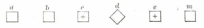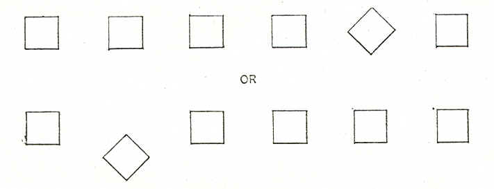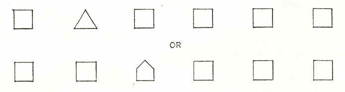 2. COLOURED COVER.―Instead of the usual black cover a coloured cover was used in these experiments. A square of the same colour as that of the cover was placed in the series of squares. 3. STRANGE SHAPE.―One of the coloured squares was here of some peculiar shape, of the form of a triangle, oblong rectangle, rhomboid, pentagon, star, etc., thus