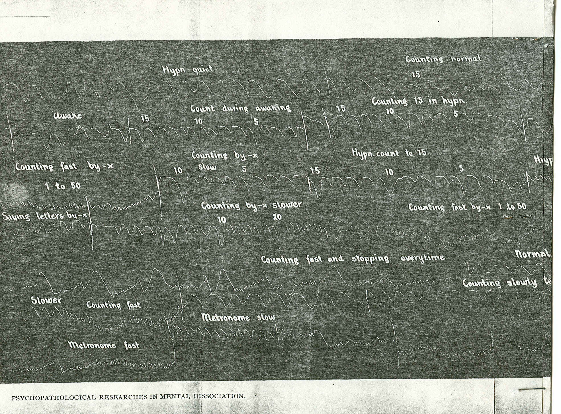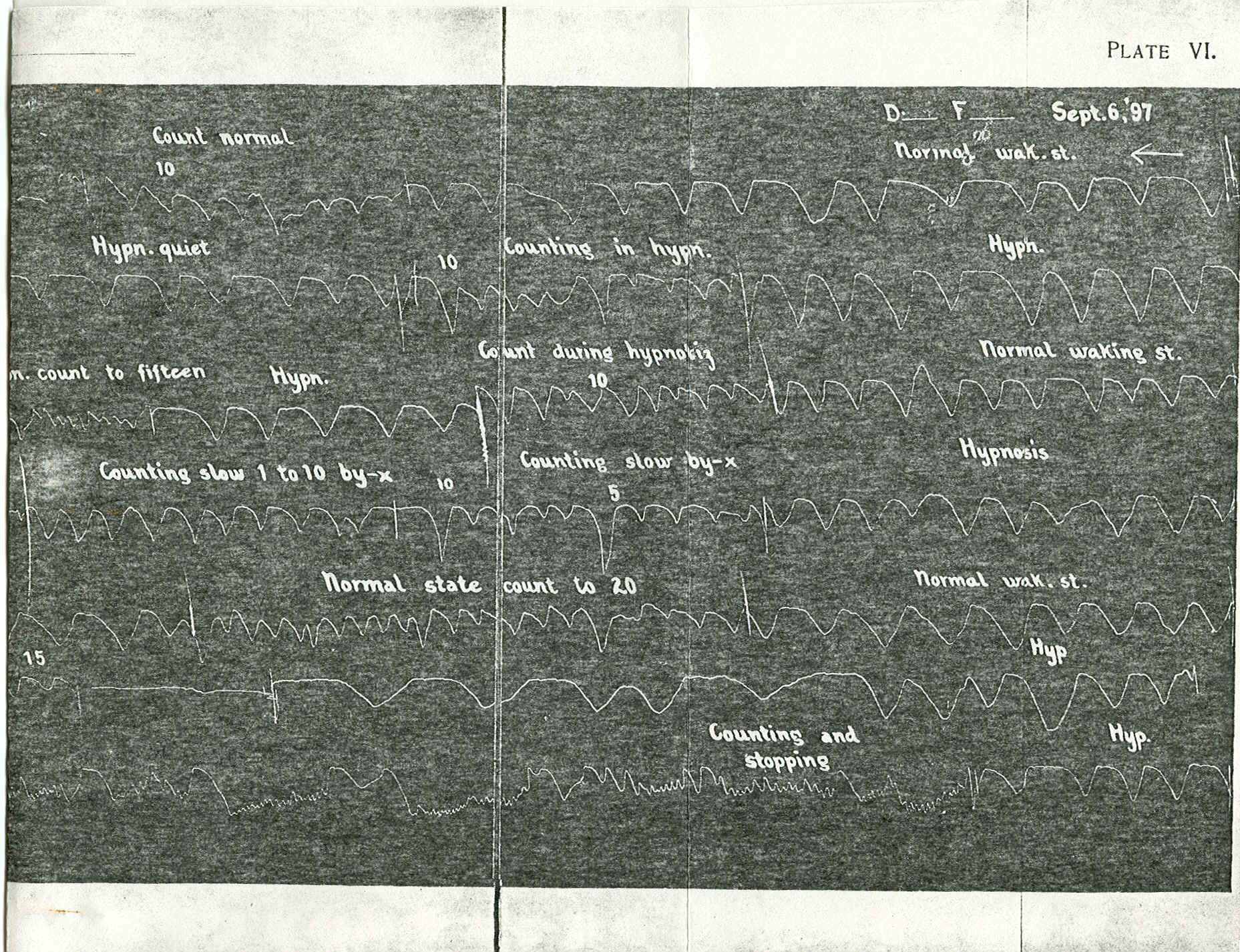 PLATE VI The patient's subconscious reactions to rhythmic stimuli, especially to counting or to metronome beats, stand out quite distinct. The spontaneously subconsciously formed habit of keeping pace with counting and beats and of deep inspirations at multiples of five is well marked. These deep inspirations become manifested when the counts or beats are slow; when they follow in quick succession the deep inspiration is not marked―seems to disappear, but reappears with slow rhythmic, Counting and sudden stops bring about corresponding disturbances in the pneumographic curve, such as observed in tracings 5 and 7. All these changes are present alike in the different rates of rhythm given by + x or - x. |