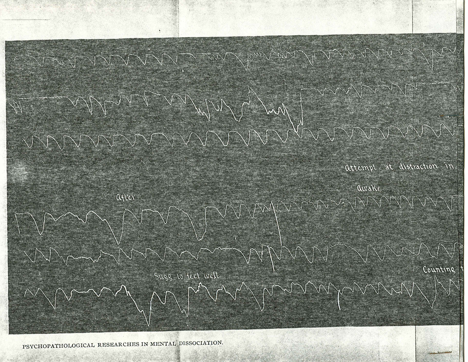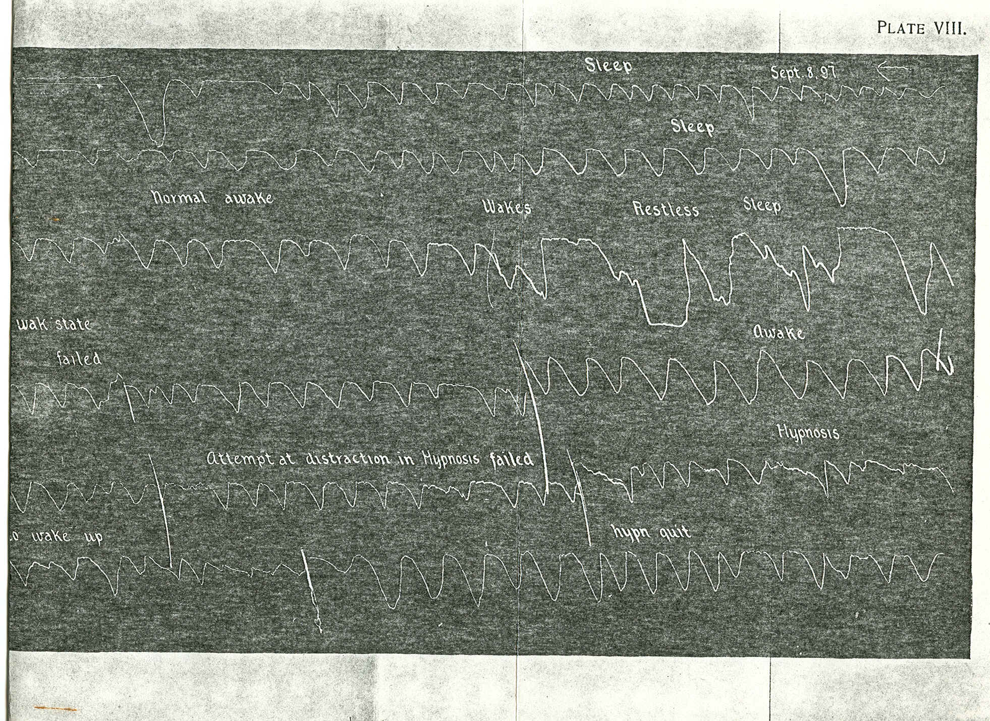 PLATE VIII The first tracing shows the patient still in normal sleep, with occasional fits of restlessness, the patient becoming more and more restless as she neared the waking state. The rest of the tracings show the patient both in the waking state and in hypnosis and the different reactions made during attempts at distraction which utterly failed. Rhythm is not followed; respiratory disturbances at multiples of five in counting are not present. The subconscious habit disappeared with the formed synthesis in the normal sleeping state. |
