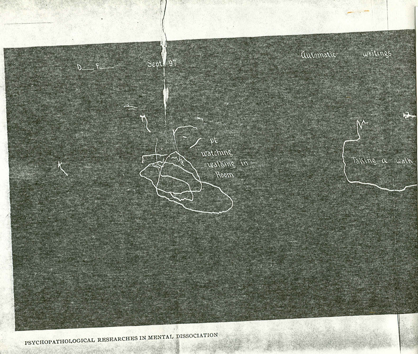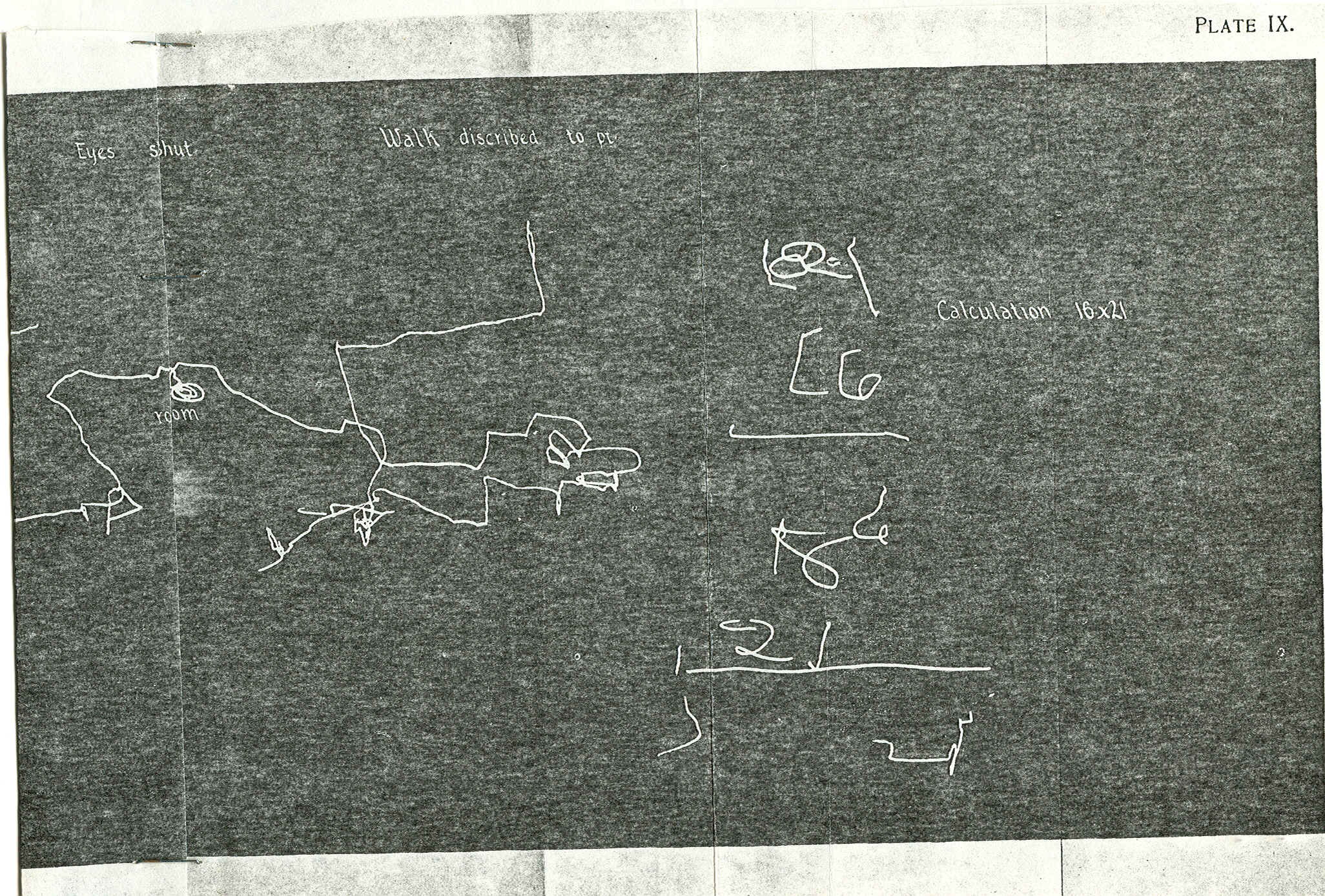 PLATE IX Tracings by the automatograph. The patient in the normal waking state was asked to shut her eyes and her hand was put on the automatograph and she was asked to make a mental multiplication of sixteen and twenty-one. While she was making this calculation, the hand was making movements corresponding to the ideas passing in her mind,―was writing down the stages in. the process of multiplication. For the other tracings she was put in the same position, and in one tracing a journey was described to her and in the other she described a journey; the hand automatically followed out the description. |