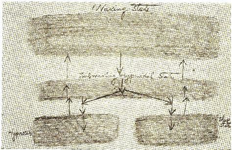 V. HYPNOIDAL STATES. What do we produce by the method of hypnoidization? We produce a peculiar state which, for lack of a better term, I designate as “hypnoidal.” What is the hypnoidal state? The hypnoidal state is essentially a borderland state. The subject is apparently awake and seems to be in full possession of all his powers, and still he is more closely in touch with the dissociated experiences than he is otherwise in the full waking state. Perhaps the subwaking state would possibly be an apt term for the hypnoidal condition. The subject seems to hover between the conscious and the subconscious, somewhat in the same way as in the half-drowsy condition we hover between wakefulness and sleep. The hypnoidal state is not a stable condition, it keeps on fluctuating from moment to moment; now falling more deeply into a subconscious condition in which outlived experiences are easily aroused, or again rising to the level of waking states. In such conditions the patient often tells you “something has come . . ., but it is gone.” The hypnoidal state has changed, it has become ligther, and the dissociated moments have become again submerged. There is a constant struggle going on in the hunting out of the stray dissociated systems. The state brought about by hypnoidization is essentially a transient, evanescent, mental disaggregation of the personal consciousness from the reflex subconsciousness. The hypnoidal state borders closely on light hypnosis; and still it is not exactly a hypnotic state and may be regarded as an intermediate state. In a series of experiments on the nature of sleep of lower animals as well of infants and adults, now being carried on by me at the physiological laboratory of Harvard Medical School and in my own laboratory, the facts tend to indicate that the hypnoidal state is intermediary between hypnosis and sleep on the one hand and the waking state on the other [see also An Experimental Study of Sleep ]. The relation may be represented by the following diagram:
